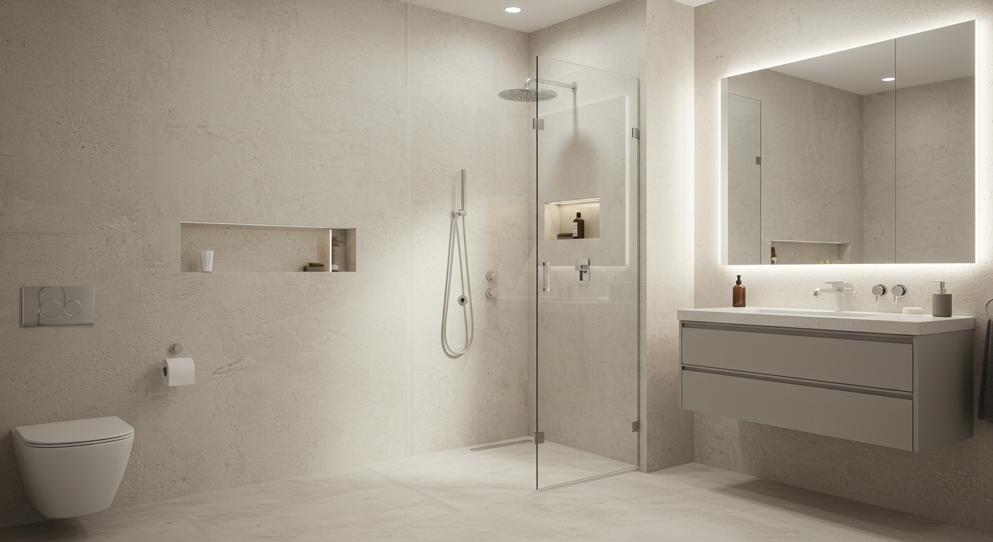 Дизайнеры ценят этот инновационный материал за его свойства: водонепроницаемость и монолитную структуру, он становится всё более популярной альтернативой плитке. Микроцемент или микробетон отлично комбинируется с другими материалами, позволяя создавать уникальные решения. В сравнении с плиткой и акриловыми покрытиями микроцемент в душевой — это отсутствие швов, высокая устойчивость к влаге и простота ухода. Выбирая бесшовную зону душа, вы избавляетесь от мест обитания бактерий, обеспечивая максимальную гигиеничность пространства. Микроцемент в душевой — одно из лучших решений и выбор дизайнеров, ценящих надежность и функционализм.